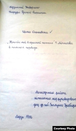 Жепниковска: Мне сейчас трудно сказать, в какой степени творчество Айтматова привлекало тогда польских литературоведов, но моя задача состояла в том, чтобы в магистерской работе ответить на вопрос, насколько удачно это произведение киргизского писателя переведено на польский язык. У нас на курсе темы магистерских работ нескольких студентов касались произведений Айтматова. Кроме моей исследовательской работы моими коллегами также рассматривались произведения Ч. Айтматова«Прощай, Гульсары», «Ранние журавли».