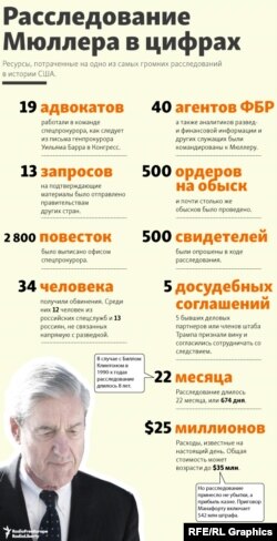 За время работы группы Мюллера были предъявлены более 200 обвинений 34 физическим и двум юридическим лицам. 26 обвиняемых – граждане России. Шестеро – бывшие советники Дональда Трампа: бывший советник президента по национальной безопасности Майкл Флинн, бывший глава избирательного штаба Пол Манафорт, бывший заместитель главы избирательного штаба Рик Гейтс, бывший личный адвокат Трампа Майкл Коэн и бывший советник Трампа Роджер Стоун. Обвинения в их адрес, однако, не связаны со "сговором" с Россией.